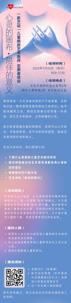心靈畫布.陪伴的義意 – 兒童病房藝術陪伴 志願者培訓 及 親子活動 “製作布娃娃” Posted on June 28, 2025July 12, 2025 by artforallhk 10-11 Nov 2024 Venue: 北京 合辦: 北京新藝動 Share this: Click to share on X (Opens in new window) X Click to share on Facebook (Opens in new window) Facebook Like Loading...